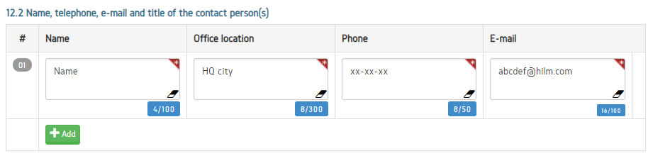 The partner can add as many names of contact person as deemed necessary. Ideally, the partner will provide at least the name of one person at headquarter and one person in the field.
