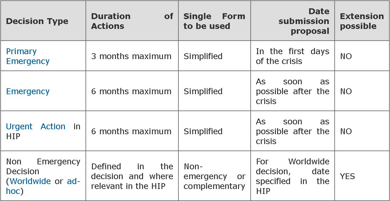The Decisions are taken to address the identified humanitarian needs and to cope with new emergencies and unforeseeable needs that arise during the year.