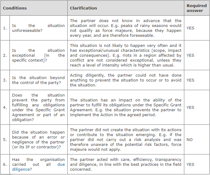 To determine whether a situation qualifies as force majeure, the partner must be able to answer to the questions posed in the table with 'yes' in all cases, with the exception of point 5 where the answer should be 'no'.